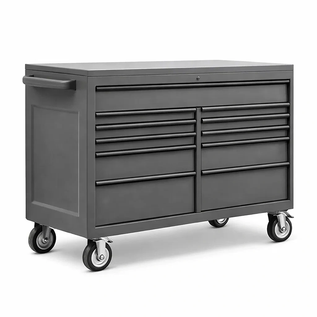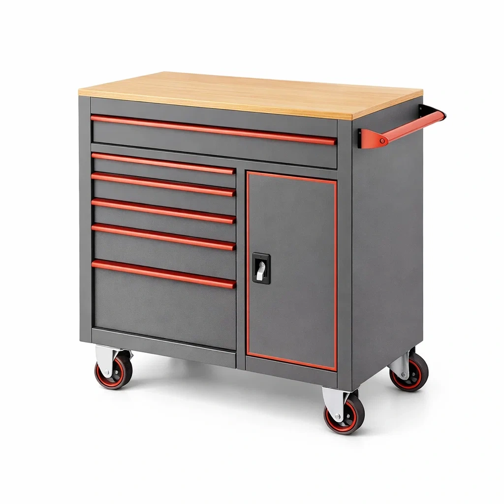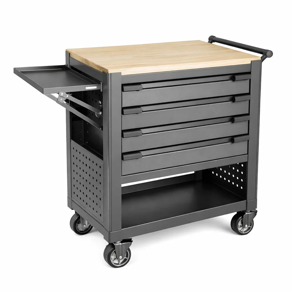 Carrello portautensili in Acciaio Grigio con Piano in Legno e Cassetti Multipli