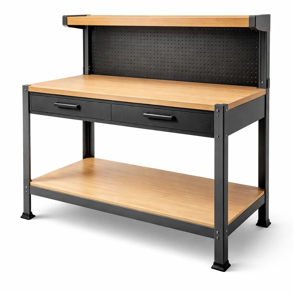 Banco da lavoro con struttura in acciaio verniciato nero e superficie in MDF, adatto per uso interno. La solida struttura supporta fino a 150 kg. Include cassetti integrati e pannello posteriore forato.