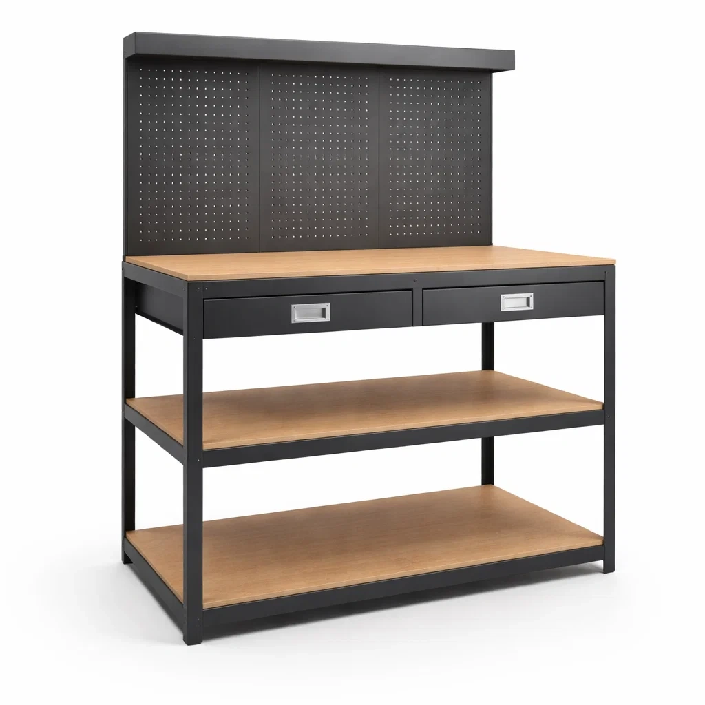 Dispone di cassetti integrati per lo stoccaggio degli attrezzi e mensole. Il pannello posteriore forato consente di fissare strumenti extra.