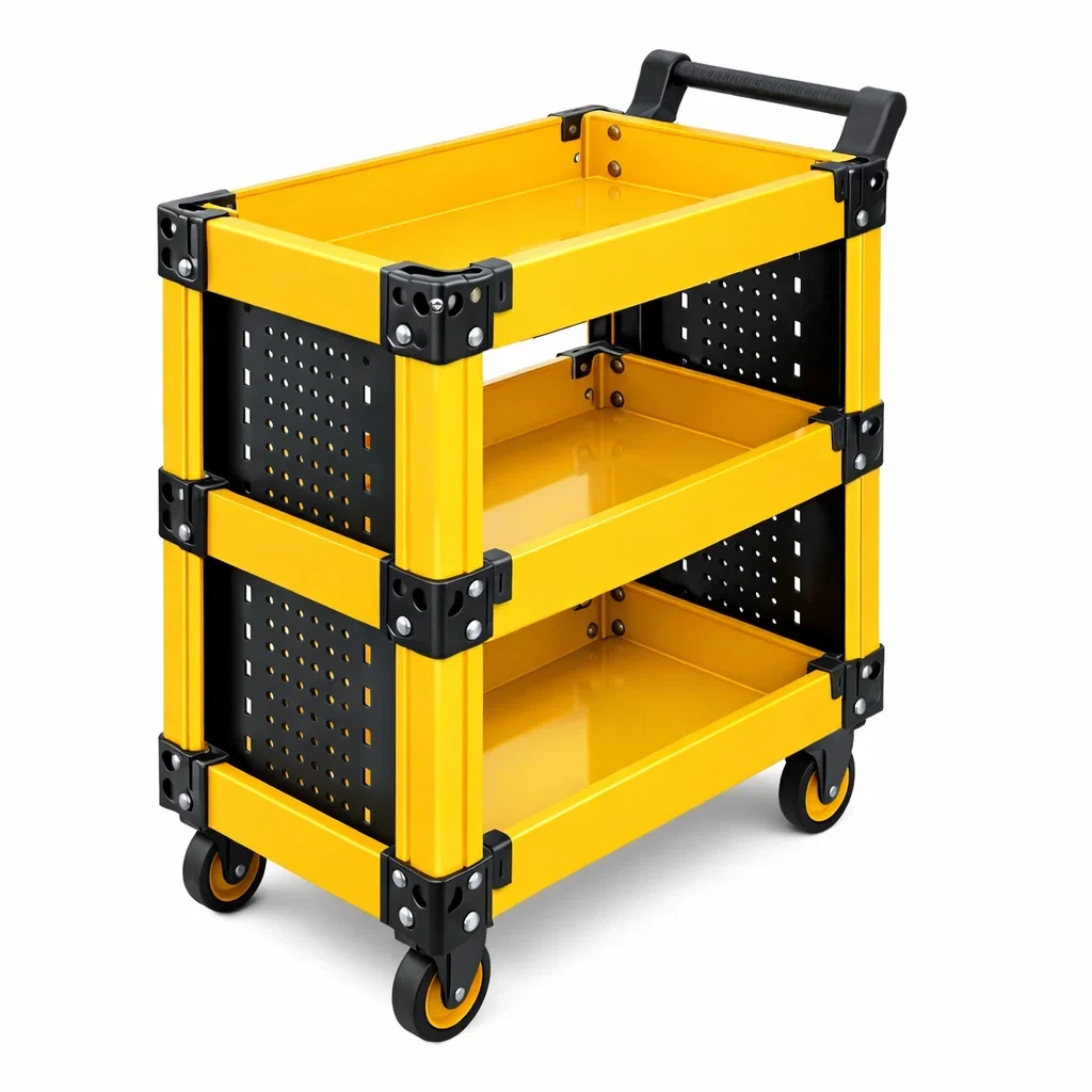 Il carrello presenta una struttura in acciaio con pannelli in plastica per maggiore durabilità. La combinazione di colori giallo e nero gli conferisce un aspetto distintivo. Le dimensioni sono di 70 cm di lunghezza, 40 cm di larghezza e 85 cm di altezza. È dotato di tre ripiani, ognuno con una capacità di carico di 25 kg. Equipaggiato con quattro ruote girevoli in gomma per facilitare lo spostamento.