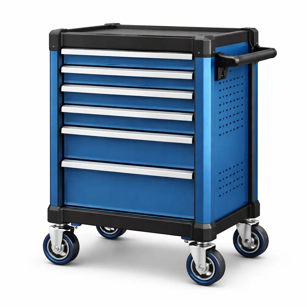 Include 6 cassetti e 4 ruote girevoli per un facile spostamento. Le ruote sono dotate di un sistema di bloccaggio per garantire sicurezza.