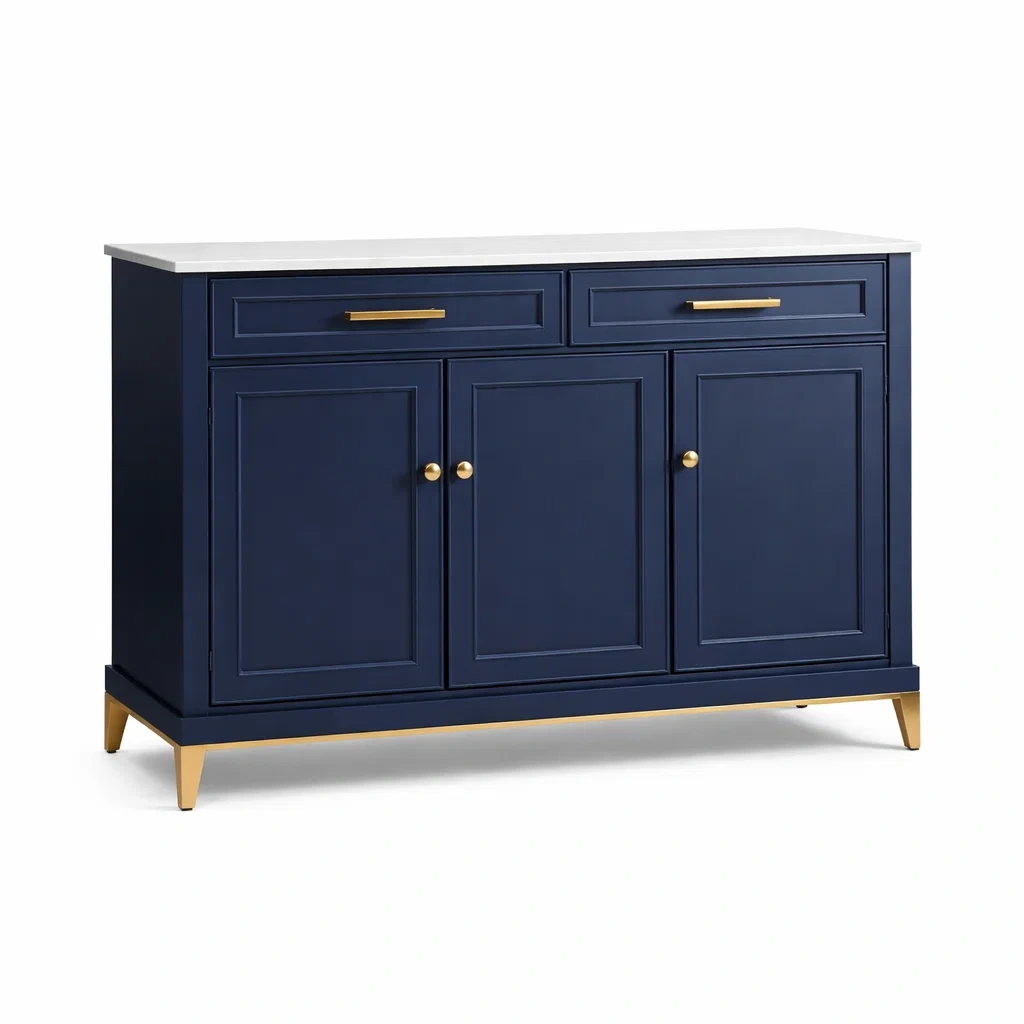Questa credenza è composta da una struttura in MDF con finitura blu, un piano in marmo bianco e gambe in metallo dorato.