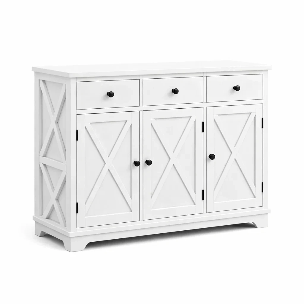 Caratteristiche: Credenza con cassetti e ante dotata di maniglie in metallo verniciato nero.