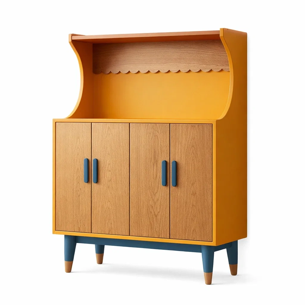 La credenza è realizzata in MDF con finitura in legno chiaro e gambe in legno massello. Presenta quattro ante battenti e un ripiano superiore per ulteriore spazio di archiviazione. La struttura è robusta e il colore giallo aggiunge una nota vivace all'ambiente.